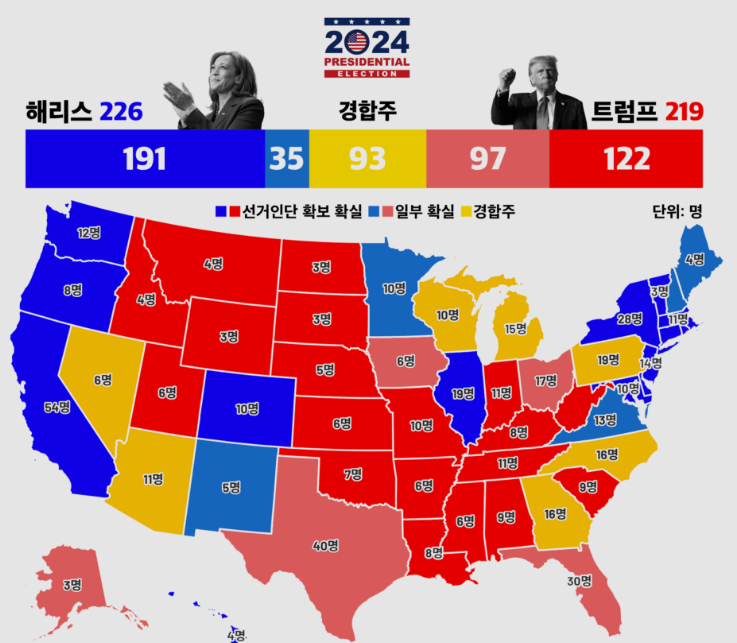 전체 선거인단은 총 538명으로, 이 중 절반 이상인 270명을 확보하는 후보가 당선됩니다.