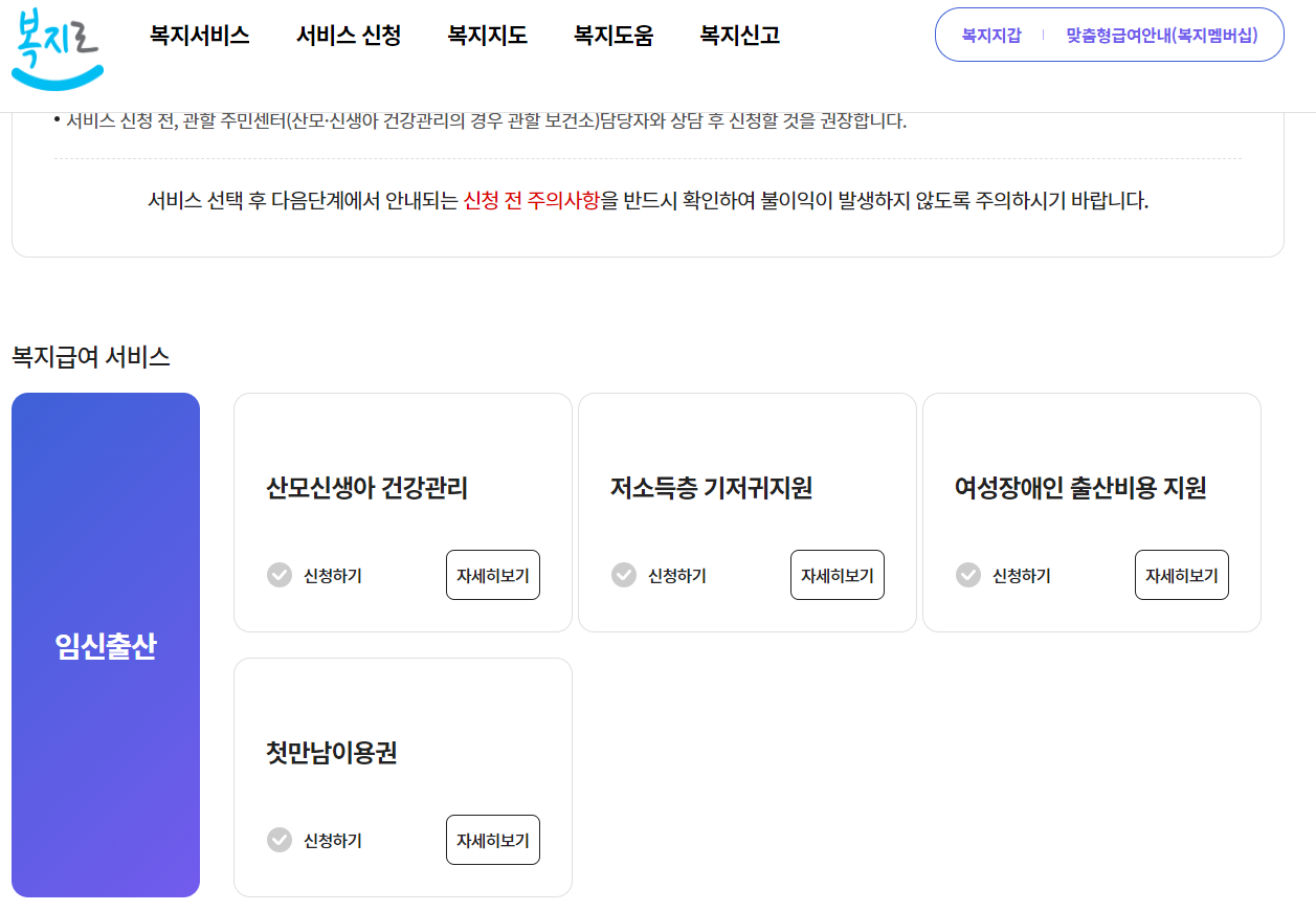 복지로 홈페이지에서는 서비스신청 – 복지급여신청 – 산모신생아 건강관리에서 신청이 가능합니다.
