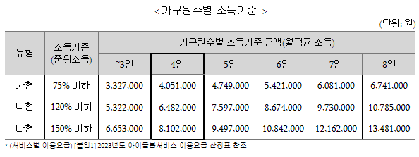 - ‘가~다’ 형 : 기준 중위소득이 150% 이하인 가구