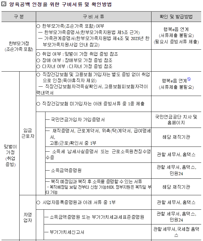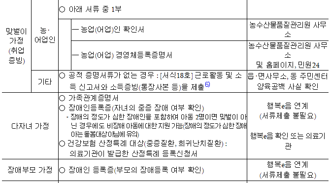 맞벌이가정, 한부모(취업・장애・다자녀) 가정, 장애부모가정, 청소년부모 가정, 다자녀가정, 다문화 가정, 기타 양육부담 가정임을 증빙하는 서류등 정부지원 자격 증빙자료가 필요한데요. 그 서류는 다음과 같습니다.