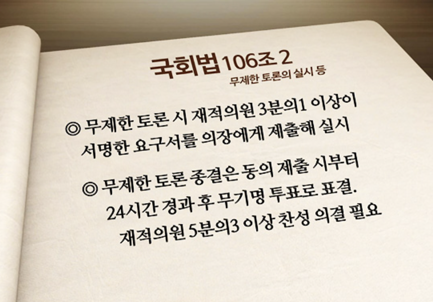 대한민국에서는 국회법 제106조의2에 따라 무제한 토론을 통해 필리버스터를 행사할 수 있는데요. 이 법은 소수당이 다수당에 맞서 소수 의견을 개진할 수 있는 기회를 보장하며, 안건이 합의를 통해 처리되도록 유도합니다.