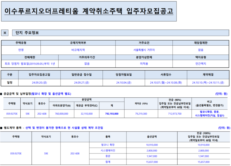 - 옵션: 발코니 확장, 시스템에어컨, 중문 설치 포함 총 1,565만 원 추가 비용