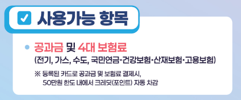 - 사용처: 전기, 가스, 수도요금 / 국민연금, 건강보험 등 4대 보험료