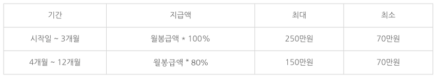 처음 3개월은 본봉의 100% 250만 원 상한으로 지급되고 4개월 이후 12개월 까지는 월봉금액의 80% 150만 원 이하로 지급됩니다.