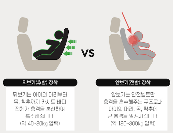 아이의 목은 성인만큼 튼튼하지 않은데요. 그래서 사고가 났을 시 목을 다칠 확률이 매우 높습니다. 그래서 카시트는 후방 장착으로 아이가 뒤를 보고 앉을 수 있어야 하는데요.