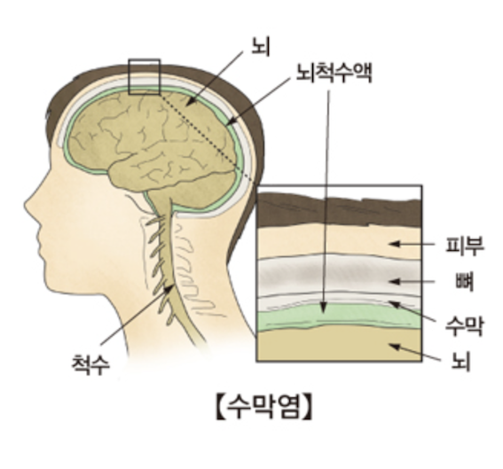 뇌수막염은 뇌를 싸고 있는 얇은 막 중 거미막과 연질막 사이의 공간에 염증이 생기는 질병인데요.