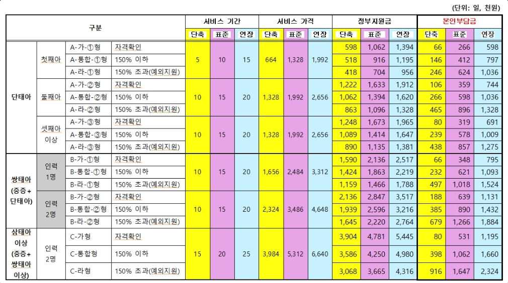 지원금은 단태아, 다태아, 이용기간, 지원유형, 소득수준에 따라 다르게 지급 됩되는데요.