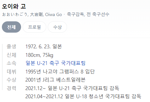 오이와 고 감독은 2021년 U-21 대표팀 감독을 시작으로 2022년에는 U-23 대표팀 감독, 2022 항저우 아시안게임 감독을 맡았었는데요. 결승에서 한국에게 져 은메달을 땄습니다