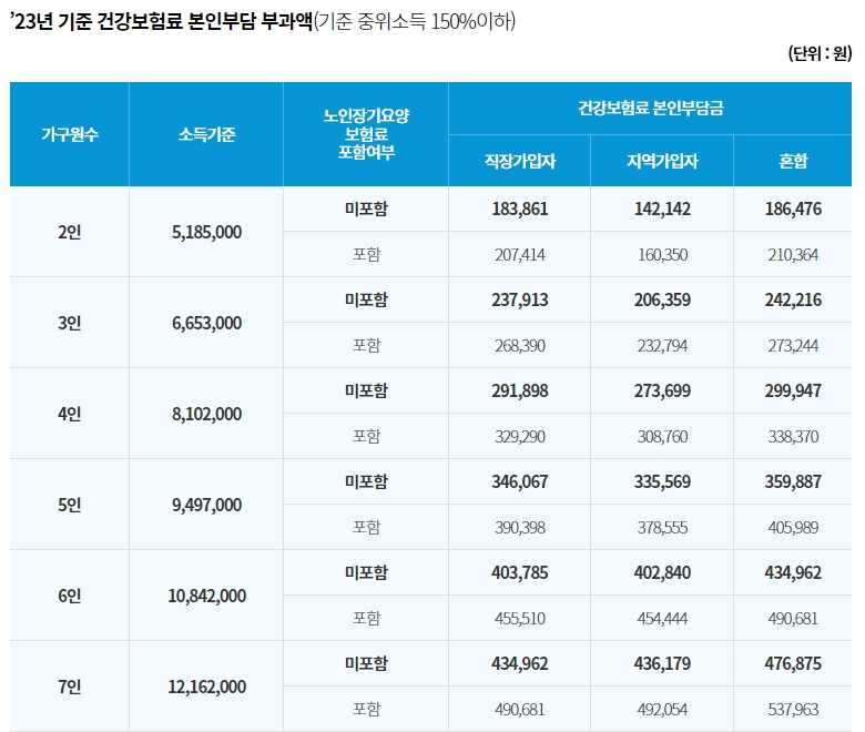 기준 중위소득은 건강보험료 본인부담 부가액을 기준으로 하는데요. 23년 기준 건강보험료 본임부담 부과액은 다음과 같습니다.