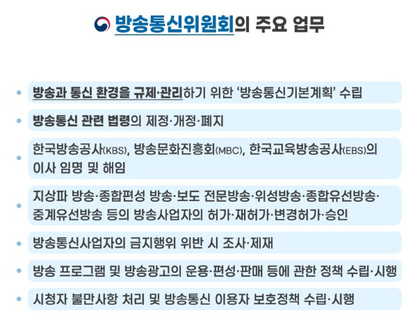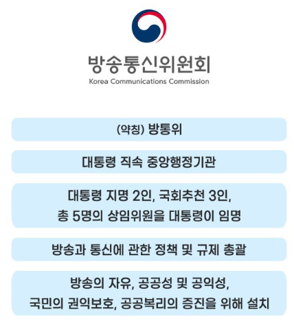 방송통신위원회는 대한민국 대통령 직속기관으로 방송과 통신에 관한 규제 및 이용자 보호 등의 업무를 관장하는 기관입니다.
