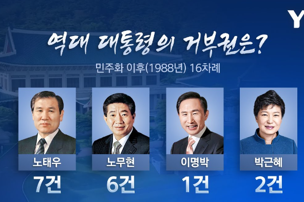 이승만 대통령은 헌정사상 가장 많은 45건의 법률안에 거부권을 행사했습니다. 노무현 대통령은 4차례 거부권을 행사했으며, 이명박 대통령은 1건, 박근혜 대통령은 2건의 법률안에 대해 거부권을 행사했습니다.