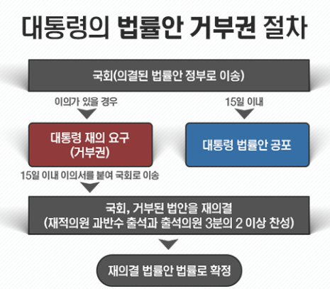 대한민국 헌법 제53조는 대통령의 거부권 행사 절차를 규정합니다. 국회에서 의결된 법률안은 정부에 이송되어 대통령이 15일 이내에 공포해야 하며, 이 기간 내에 이의를 제기할 경우 국회로 환부하여 재의를 요구할 수 있습니다.